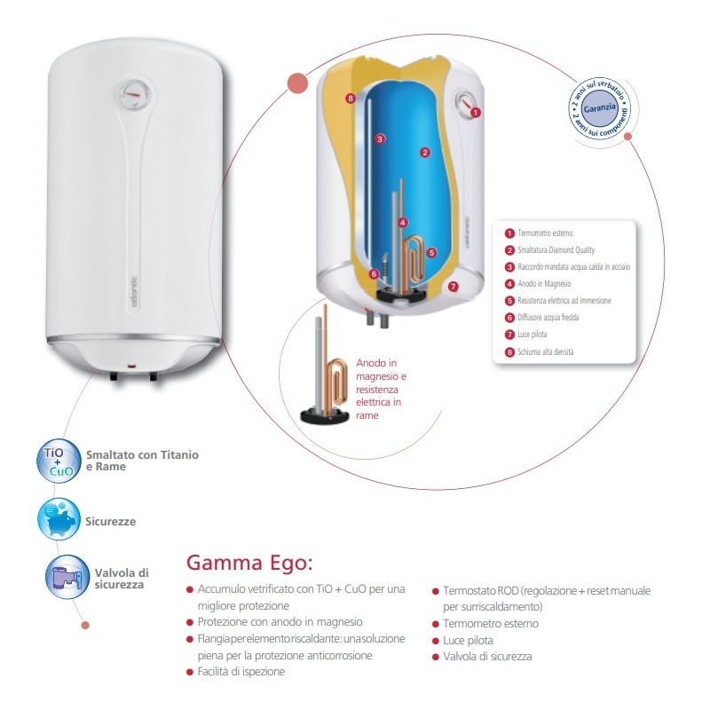 - Lo scaldabagno ha la caldaia in acciaio con smaltatura vetrificata in titanio e rame Diamond Quality mentre la coibentazione è realizzata in schiuma ad alta densità senza CFC, quindi ecologica ed altamente isolante per il massimo risparmio energetico. E’ dotato di anodo di magnesio e flangia per l’elemento riscaldante per una maggiore protezione contro la corrosione; il grado di protezione elettrica IP 25 è conforme alle normative europee.