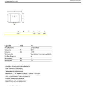 Scaldacqua elettrico con caldaia vetrificata; Anodo di magnesio; Resistenza a vite per mod. 2 anni ed a flangia per mod. 5 anni. Per la sostituzione in garanzia conservare garanzia più scontrino fiscale. Lo Scaldabagno è fornito di Giunto Dielettrico, utile per preservarlo dalle Correnti Elettrostatiche che possono attaccare e danneggiare lo Scaldabagno.
