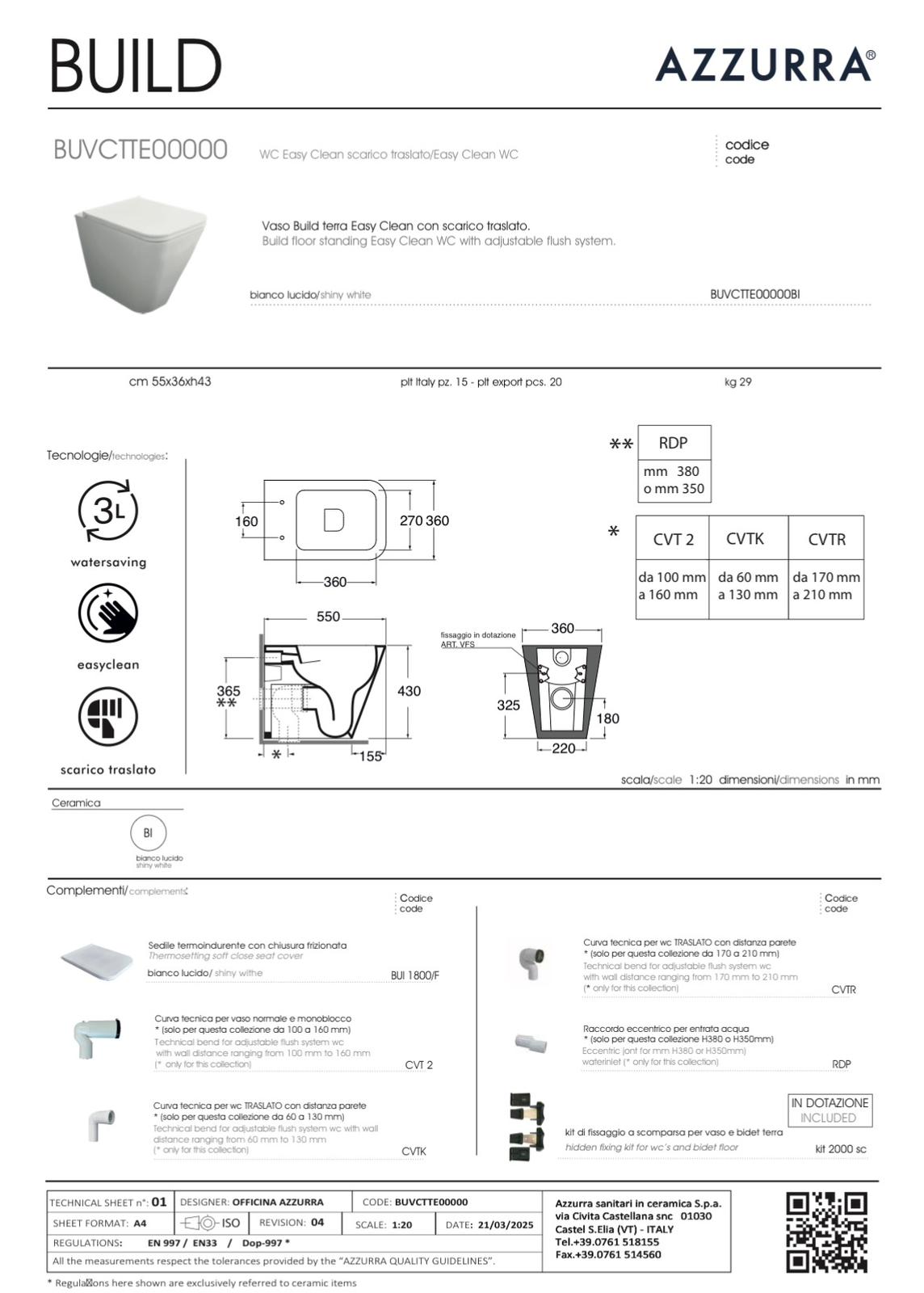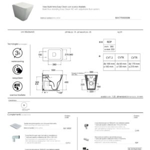 Build vaso wc Easy Clean traslato, scarico Water Saving, dimensioni 55x36xH42 cm, finitura bianco lucido, Design Officina Azzurra