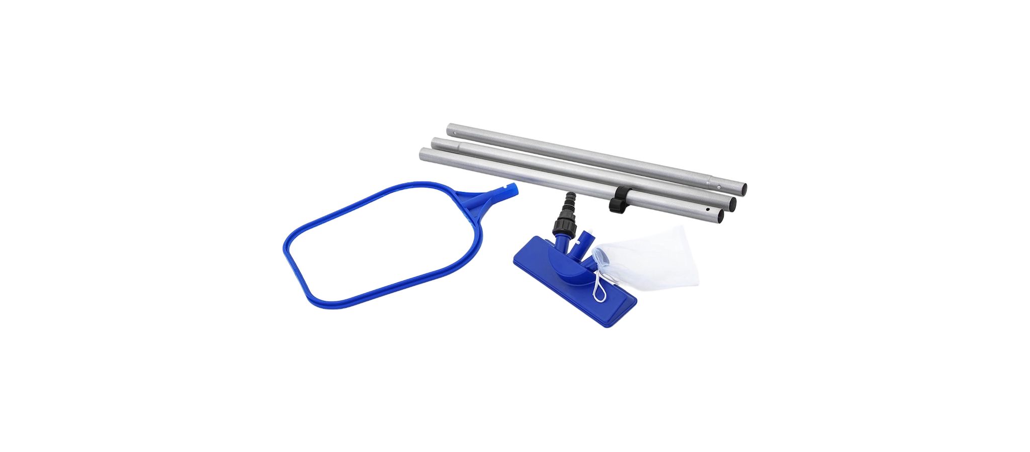 Il kit di manutenzione per piscine fino a 396 cm comprende un palo in alluminio con una testa intercambiabile per aspirare e uno skimmer.