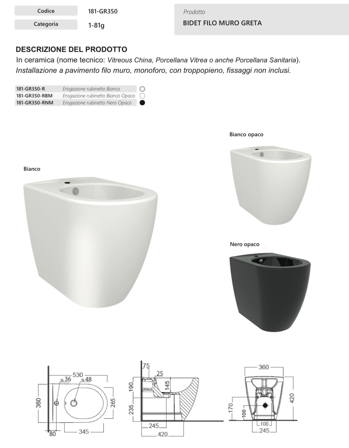 BIDET FILO MURO BIANCO OPACO MOD. GRETA
