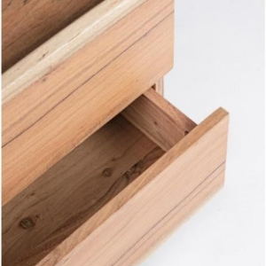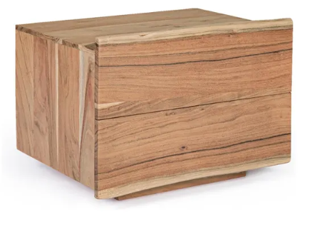 Comodino a 2 cassetti dal design moderno. La sua struttura è interamente costruita in legno a finitura naturale. Tutte le forme del comodino sono state modellate a mano, creando un complemento unico, originale e dall’aspetto contemporaneo, perfetto per impreziosire con un tocco naturale e rustico la camera da letto.