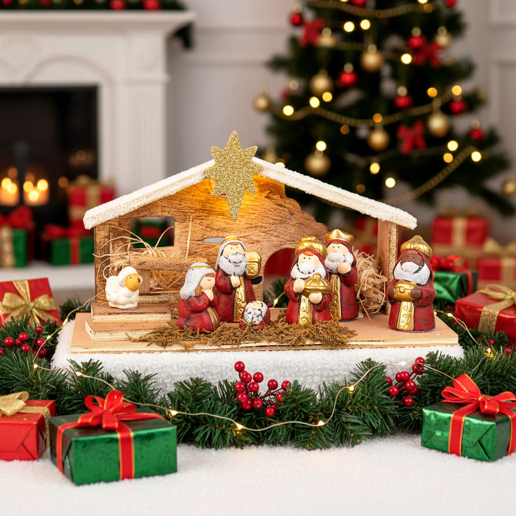 Si tratta di una composizione che include la capanna, gli elementi della Sacra Famiglia (e possibili altre figure), e un sistema di illuminazione a LED integrato che conferisce un’atmosfera calda e suggestiva, perfetta per valorizzare ambienti domestici, spazi commerciali o punti espositivi nel periodo natalizio.
