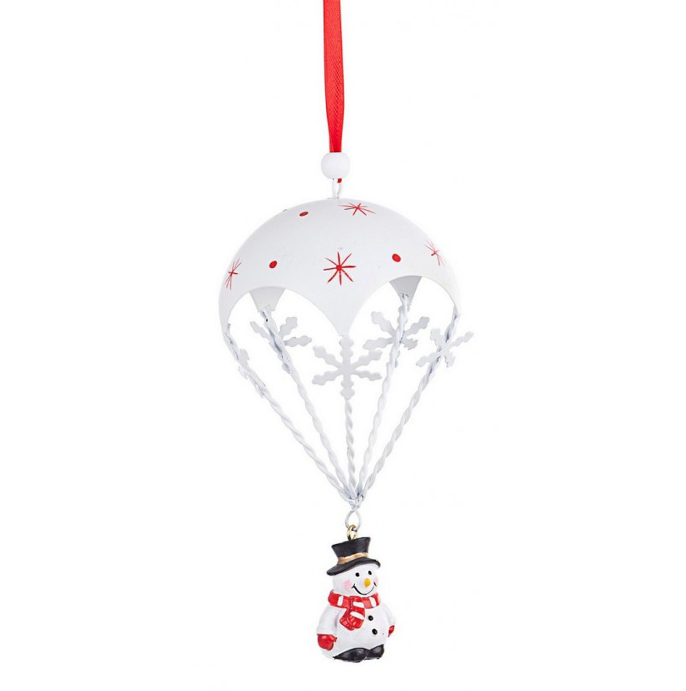 Design originale e giocoso: la forma “paracadute” con pupazzo bianco dona movimento e allegria alla decorazione natalizia, distinguendosi dalla classica sfera o pendente.