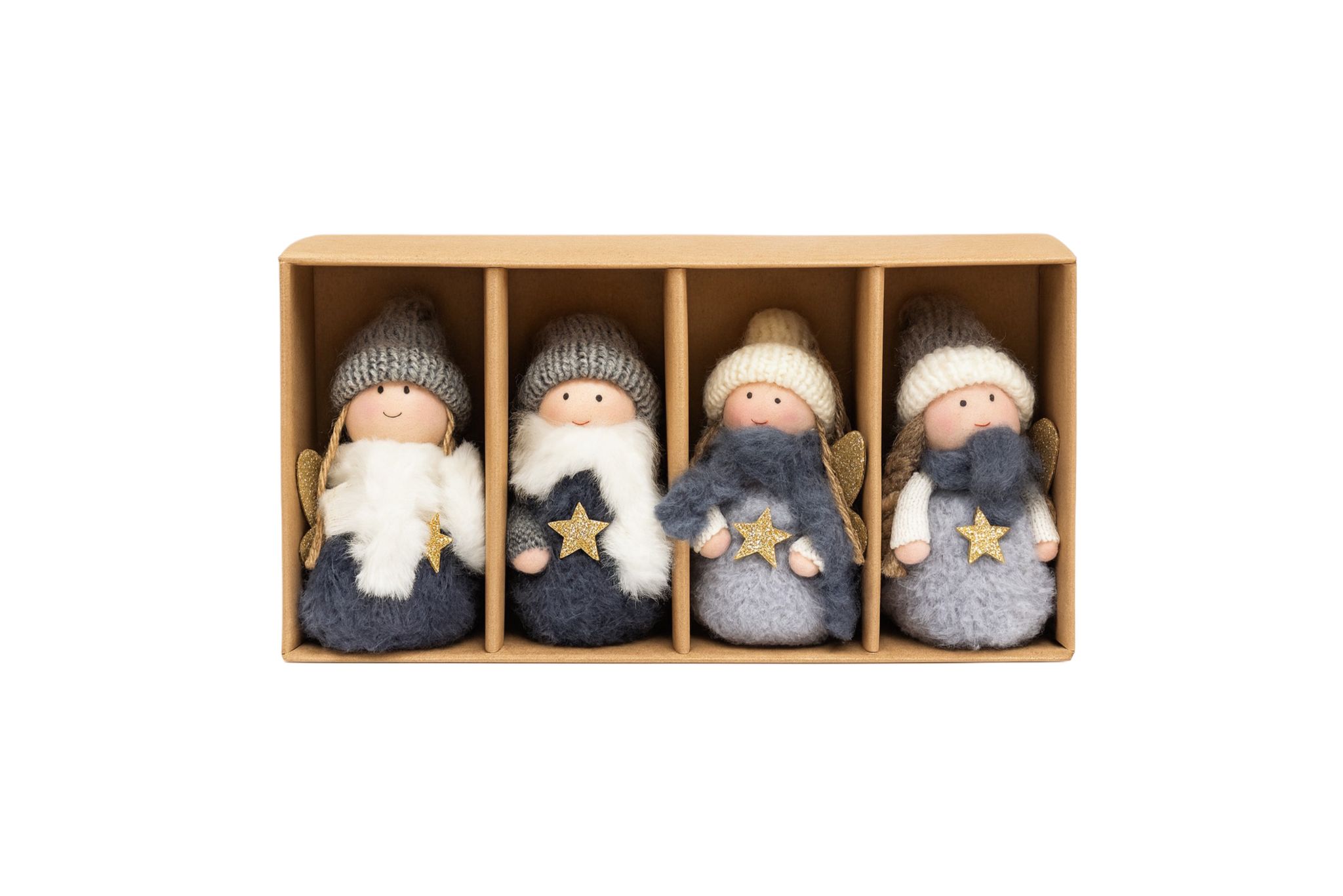 Ogni angelo è abbellito da ali luminose, vestitini in tessuto morbido e piccoli dettagli dorati o argentati che valorizzano il design e donano un effetto brillante sotto le luci dell’albero.