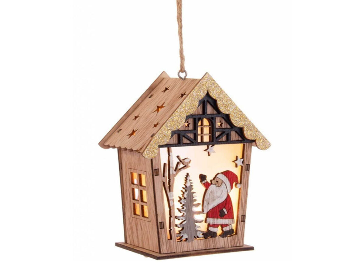 Questo è il pendaglio di Natale in legno che raffigura una casa con Babbo Natale.