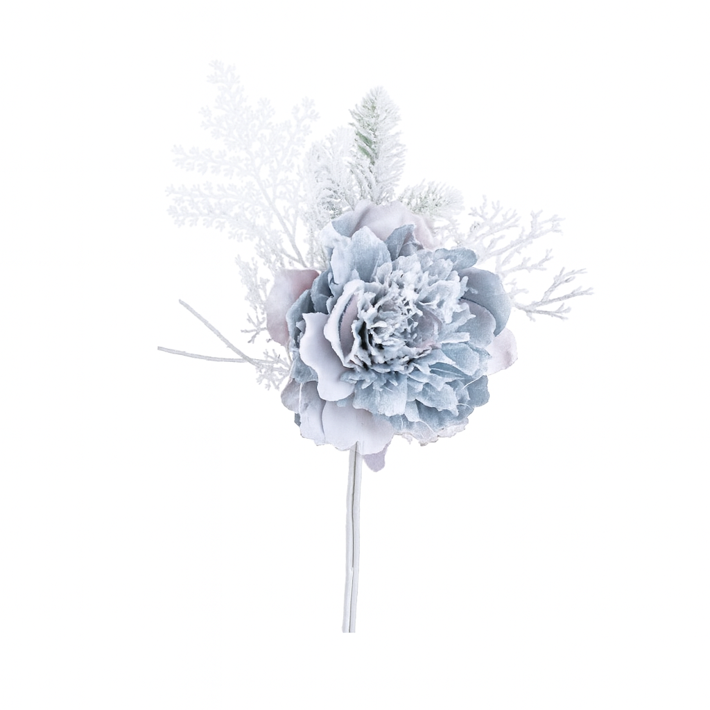 Il pick Ginny Nebbia si distingue per la sua peonia in morbide tonalità nebbia, un grigio chiaro vellutato e moderno, impreziosita da un delicato effetto innevato che ne esalta la luminosità e il fascino invernale. Le foglie e i dettagli realistici completano la composizione, rendendola ideale per addobbare ambienti, ghirlande, alberi o centrotavola natalizi.