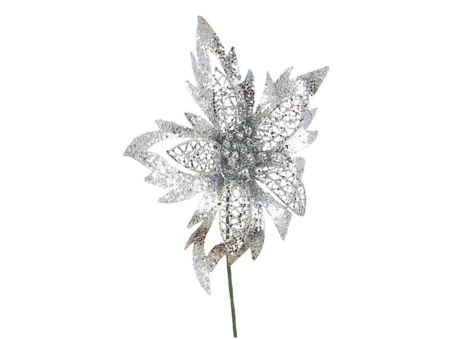 Design elegante e luminoso: poinsettia argentata con effetto glitter per un tocco raffinato e festivo.
