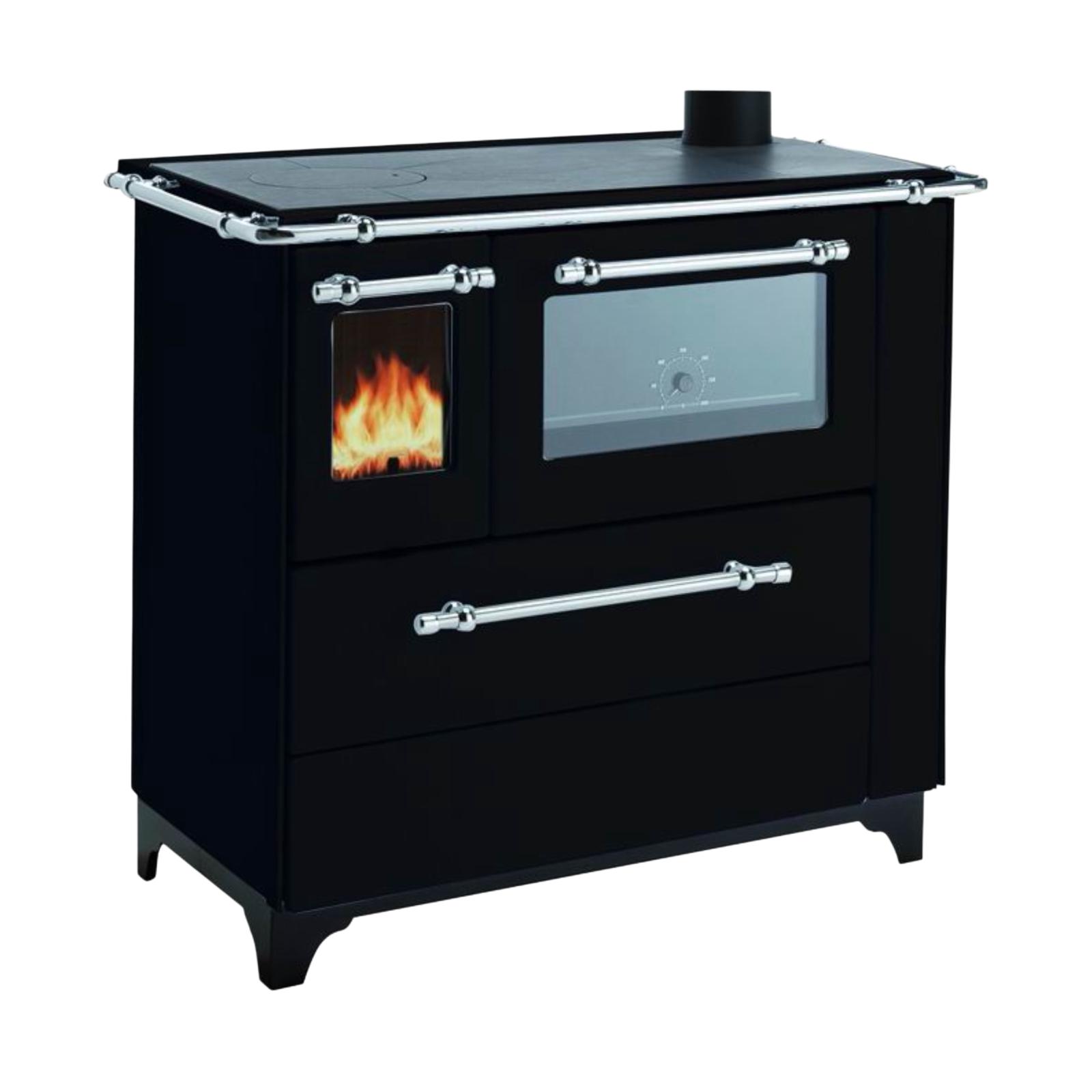La Royal modello Betty è dotata di forno in acciaio smaltato nero con vetro ceramico e pratico termometro. Il forno viene scaldato dal calore del focolare.