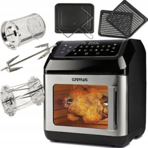 - Accessori: 3 vassoi, cestello, spiedini, girarrosto, maniglia