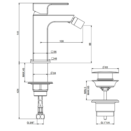Miscelatore bidet con scarico automatico e flex inox di alimentazione GATTONI, serie KUBIK