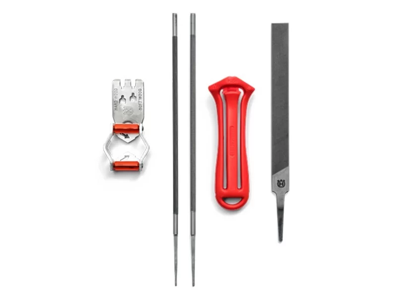 Set completo che vi aiuterà a mantenere la vostra catena sempre perfettamente affilata. Il kit comprende un manico, un riscontro combinato o un blocchetto di riscontro e una piastra, due tondini da 4,80 mm, e una lima piatta lunga 15,24 c