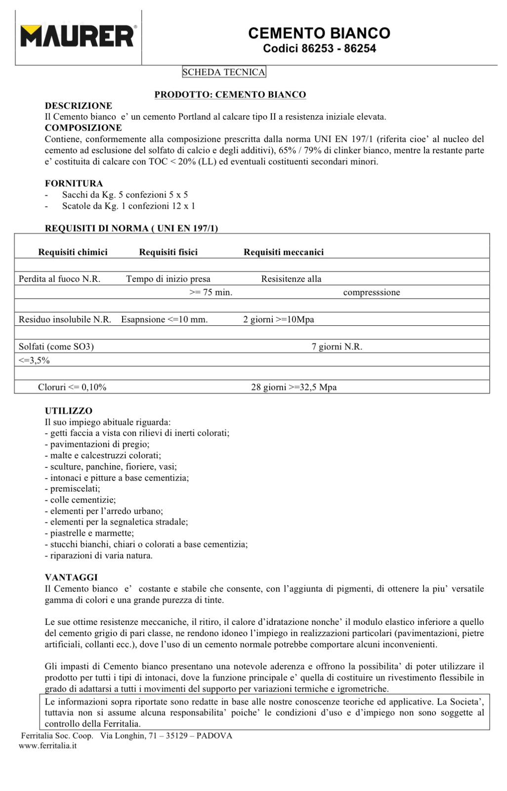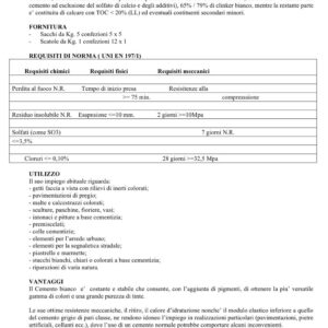 Le sue ottime resistenze meccaniche, il ritiro, il calore d’idratazione nonchè il modulo elastico inferiore a quello del cemento grigio di pari classe, ne rendono idoneo l’impiego in realizzazioni particolari (pavimentazioni, pietre artificiali, collanti ecc.), dove l’uso di un cemento normale potrebbe comportare alcuni inconvenienti.