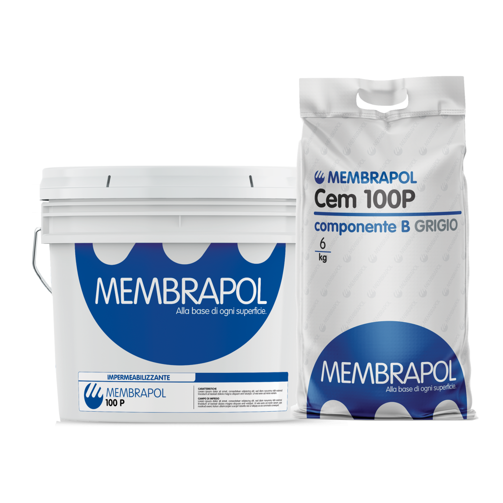 MEMBRAPOL CEM 100 P è stato progettato e formulato per realizzare in opera una guaina liquida cementizia ad elevata elasticità idonea a impermeabilizzare superfici in calcestruzzo o muratura, vecchie impermeabilizzazioni da ripristinare, pavimenti in ceramica, intonaci e massetti cementizi. È un impermeabilizzante a due componenti: il componente A, liquido, è una speciale emulsione ad alto contenuto di polimero studiata per fornire elevata aderenza, traspirabilità, impermeabilità ed elevata elasticità; il componente B, in polvere, è composto da selezionati leganti idraulici, inerti di elevata qualità e opportuna granulometria, e da speciali additivi.