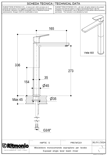 Miscelatore monocomando soprapiano per lavabo Ritmonio Haptic S PR57AF201CRL finitura cromo lucido, design minimale, qualità costruttiva elevata.