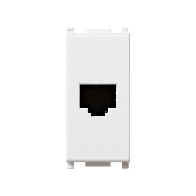 La presa telefonica e di plastica con la parte da incassare di colore verde e la parte a vista bianca lucida.