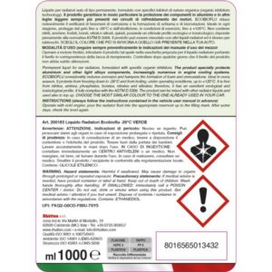 Liquido per radiatori auto di tipo permanente, formulato con inibitori di natura organica. Il prodotto garantisce in modo particolare la protezione dei componenti in alluminio e in altre leghe leggere sempre più presenti nei motori di ultima generazione. ECObioflu riduce notevolmente il verificarsi di fenomeni di corrosione e la formazione di incrostazioni. Protegge dal gelo fino a -26°C e dall’ebollizione, in condizioni di esercizio, fino a +120°C. Non contiene nitriti, ammine, fosfati, borati, nitrati e silicati, quindi, possiede un ottimale profilo ecologico e tossicologico; risponde pienamente alla normativa ASTM D 3306. Il prodotto può essere miscelato con altri liquidi radiatori ed è idoneo per rabbocchi.
