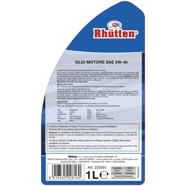 RHUTTEN OLIO MOTORE 5W-40 SAE 1LT SINTETICO 220081