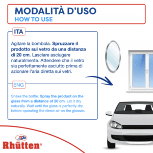 Agitare la bombola. Spruzzare il prodotto sul vetro da una distanza di 20 cm ca. inumidendolo bene in modo uniforme. Lasciare asciugare naturalmente (senza passare nessun panno). Attendere che il vetro sia perfettamente asciutto prima di azionare l’aria diretta sui vetri. Per velocizzare l’asciugatura, accendere l’aria calda dell’auto facendo attenzione a direzionare il getto solo in basso e frontalmente.