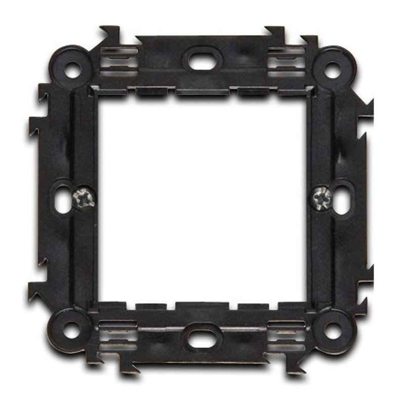 Supporto in policarbonato Master con graffette, 2 moduli universale, appartenente alla linea civile ‘Modo’ e ‘Mix’. E’ il supporto adatto per scatole da incasso rotonde con diametro pari a 60 mm, e permette di agganciare solo le placche Master Modo e Mix. I supporti vengono fissati, tramite viti, alle scatole da incasso permettendo il montaggio di placche della relativa serie.