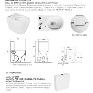 Il Vaso WC Monoblocco Genziana Filo Muro Rimless 182-Z470 è una soluzione completa e funzionale, pensata per ambienti bagno moderni che uniscono design, praticità e massima igiene. Il sistema monoblocco filo muro garantisce una perfetta aderenza alla parete, offrendo un’estetica pulita e ordinata e facilitando la pulizia del pavimento.