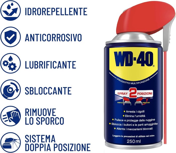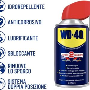 Il prodotto WD-40 Multifunzione lubrifica, elimina cigolii, sblocca, elimina l’umidità, previene la ruggine e protegge tutte le superfici metalliche.